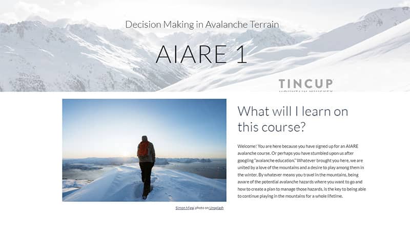 Two weeks in advance students will receive an email with instructions on how to access AIARE's Level 1 Online Learning curriculum. The online learning curriculum takes approximately 5 hours and must be completed before students may attend the pre-course zoom class.